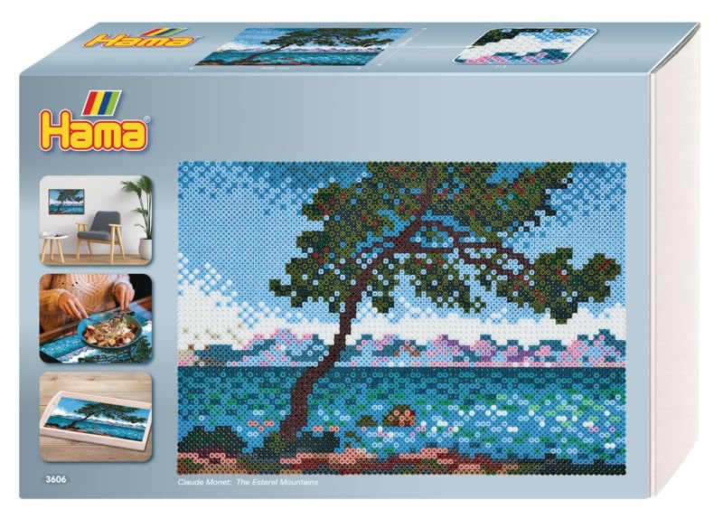HAMA ART - CLOUDE MONET. Pomocí této sady si vytvoříte obraz na zeď nebo třeba prostírání.Tvořivé hračky, certifikované, se zárukou kvality, oceněné několika cenami.Pomůcka k procvičení fantazie, zručnosti, trpělivosti, rozeznávání tvarů a barev, motoriky atd.Děti ani netuší, že dělají něco více než že si jen hrají.Balení obsahuje: cca 10.000 kusů zažehlovacích korálků, 6 x podložku velký napojovací čtverec H234, barevně tištěná předloha, zažehlovací papír a návod k použití.Doporučeno pro děti od 5 let.Rozm