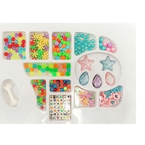 Zestaw kolorowych koralików, dzięki któremu mała dziewczynka samodzielnie będzie mogła zaplanować, stworzyć i użytkować własną biżuterię. Z koralików powstają łańcuszki, zawieszki, kolczyki, bransoletki, naszyjniki, pierścionki. Spersonalizowana biżuterię, można podarować mamie, babci lub najlepszej przyjaciółce. Takie kreatywne spędzanie czasu sprzyja rozwojowi i wspomaga kreatywne myślenie. W zestawie znajdują się także kolorowe spineczki.