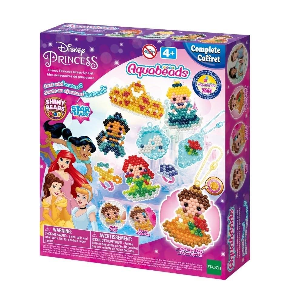 Zestaw do tworzenia biżuterii Aquabeads Księżniczki Disneya zawiera 800 kolorowych koralików, wiele elementów do tworzenia biżuterii, takiej jak broszki, korony, pierścionki, czy fantazyjnych zawieszek do kluczy, podkładkę do układania, spryskiwacz i zestaw arkuszy z szablonami. Produkt przeznaczony dla dzieci od czterech lat.