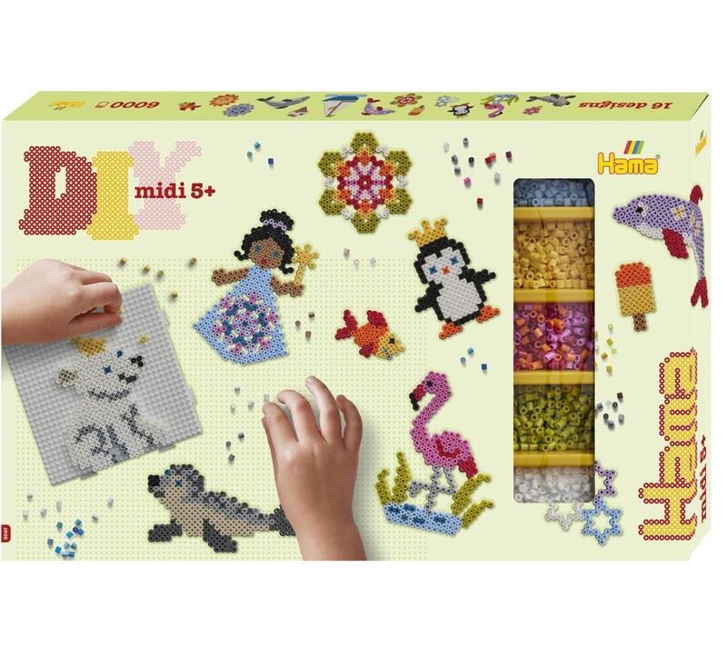Velká dárková sada 16 motivů MIDITvořivé hračky, certifikované se zárukou kvality, oceněné několika cenami.Pomůcka k procvičení fantazie, zručnosti, trpělivosti, rozeznávání tvarů a barev, motoriky atd.Děti ani netuší, že dělají něco více než že si jen hrají.Obsahuje: Cca. 6 000 korálků, 3 podložky (velký čtverec H234, velký šestiúhelník H276 a delfín H300), barevně tištěnou předlohu, návod a zažehlovací papír.Rozměry: 27,5 x 43 x 4 cm.Doporučeno pro děti od 5 let.Průměr korálku: 5 mmVyrobeno v Dánsku.