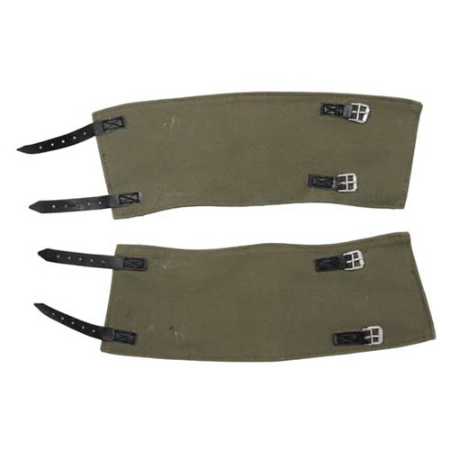 Použité spinky z výprodej BW armády rok cca kolem 1960 stejné jako WH. Kožené pásky s kovovými přezkami k nastavení délky. Barva: oliv (zelená). Materiál: pevná vlněná plachtovina.