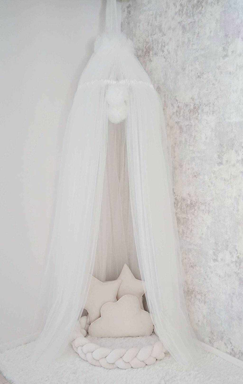 Závěsné stropní luxusní nebesa s bambulkami-baldachýn Belisima. Nebesa zavěšená nad posteli, nebo postýlkou zajistí klidný spánek bez nepříjemného hmyzu. Jsou velice užitečná v teplých letních dnech, nebo jako skvělá dekorace. Umožňují volný průchod vzduchu. Nebesa jsou zdobena krásnými bambulkami. Upevňují se zavěšením do stropu. Před praním baldachýnu je třeba vybrat kruh, který je součástí vrchní části baldachýnu. Dodávané bez upevňujícího zařízení do stropu.