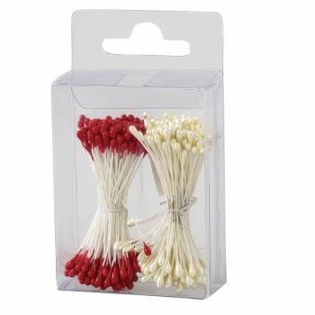 Lesklé pestíky v odstínu bílé a červené pro středy u tzv. jedlých květin vyrobené z cukrové hmoty.