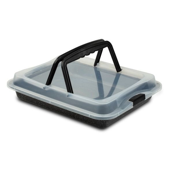 Pekáč je vyroben z pevné uhlíkové oceli a potažený žulovým nepřilnavým povrchem, který odolává poškrábání a vysokým teplotám. Díky tomu se jídlo nepřipaluje a snadno se z pekáče vyjímá. Povrch neobsahuje škodlivé látky PFOA a PTFE, což zaručuje bezpečné použití pro vaši rodinu. Praktické plastové víko pak umožňuje pohodlné skladování nebo přenášení připravených pokrmů.