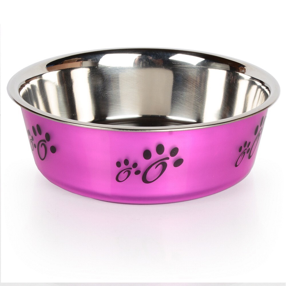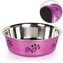 Designová nerezová miska s atraktivním potiskem psích tlapek na růžovém plastovém lemu.