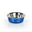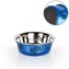 Designová nerezová miska s atraktivním potiskem psích tlapek na modrém plastovém lemu.
