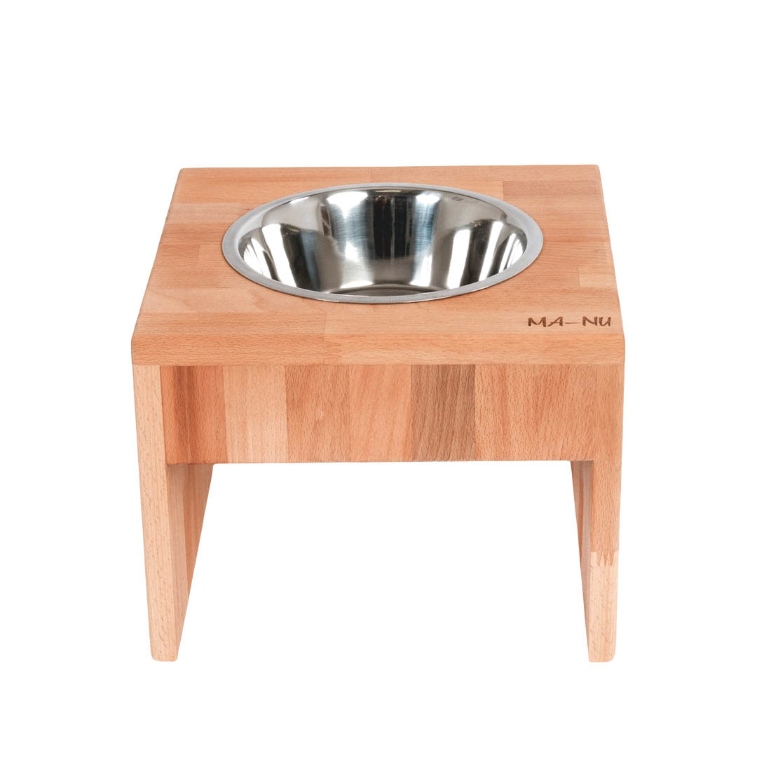 Luxusní psí bar MA-NU nabízí vašemu psímu parťákovi vyšší úroveň stolování a zdravější jedení. Podávání potravy i vody ze zvýšené polohy přináší mnoho užitečných benefitů pro zdraví našich pejsků. Zvýšené jedení významně snižuje riziko torze, vede k lepšímu trávení, pes má u stojanu stabilnější postoj, což ocení především psím senioři a nejen oni, pes nenamáhá krční svalstvo a krční páteř, klouby a svaly hrudníku.Stojany na psí misky také krásně vypadají a udělají z jídelního koutku vašeho psa luxusní psí jídelnu. Stojany jsou vyrobeny v české dílně z tvrdého bukového dřeva, které je ošetřeno velmi kvalitním olejem s atestem pro potravinářství. Olej zabrání poškozování dřeva vodou či nečistotami, zajišťuje snadnou údržbu a dlouhou životnost. Stojany dodáváme s nerezovými miskami.Proč dávat psovi jídlo do vyvýšené misky?Zvýšená poloha misky:- snižuje riziko torze žaludku, na kterou trpí hlavně velká plemena- zlepšuje trávení potravy- snižuje polykání vzduchu a následné nadýmání- páteř je v přirozené poloze - pes u stojanu drží správný postoj a je stabilnější- váha těla vašeho psa je rovnoměrně rozložena - pes nepřetěžuje klouby a svaly hrudních končetin- nenamáhá se hřbet, krční svalstvo a krční páteř- skvělá volba u velkých plemen, nebo starších psů, kteří se nemusí u vyvýšených misek přetěžovat- usnadňuje pití vody (pes méně chlemtá)- pro psí seniory „must have“ produktDůvody proč zvolit MA-NU stojan na misky:- zvýšená poloha misek přináší zdravější krmení- moderní a hezký design se hodí do každé domácnosti- vyrobeno v České republice z kvalitních materiálů- stojany jsou z ekologických materiálů- ošetřeno kvalitním olejem s atestem pro potravinářství- snadná údržba a dlouhá životnost- více druhů a velikostí- vyrobeno s láskou, poctivě a ručněVáš pes by měl být schopný jíst, aniž by snižoval krk, nebo se natahoval nahoru.MA-NU nabízí širokou a pestrou nabídku stojanů na misky jak pro malé psy, tak i pro velká plemena. MA-NU stojan One Empty má dřevěné bočnice, je velmi stabilní a vypadá velmi elegantně. Oproti variantě Empty, která je jednou z nejprodávanějších, má pouze jednu misku.Nerezové misky jsou ke stojanům zdarma.Velikosti: Velikost - šířka/hloubka/výškaS - 20cm/20cm/12cmM - 30cm/30cm/16,5cmL - 30cm/30cm/23cmPrůměr a objem misek:S - 13,5cm/0,35 lM, L - 21cm/1,6 lPoznámka: Barva dřeva na obrázku se může mírně lišit od vámi zakoupeného kusu. Každý kus je originál, dřevo je přírodní materiál, proto může vykazovat mírné odchylky v barvě. Vždy jde o bukové dřevo s olejovou úpravou. Nerezové misky vynikají vysokou odolností a materiálem, který se velmi snadno udržuje.Výrobce: MA-NU (vyrobeno v ČR)Distributor: Rebel Dog s.r.o.Poslední aktualizace: 06/2023