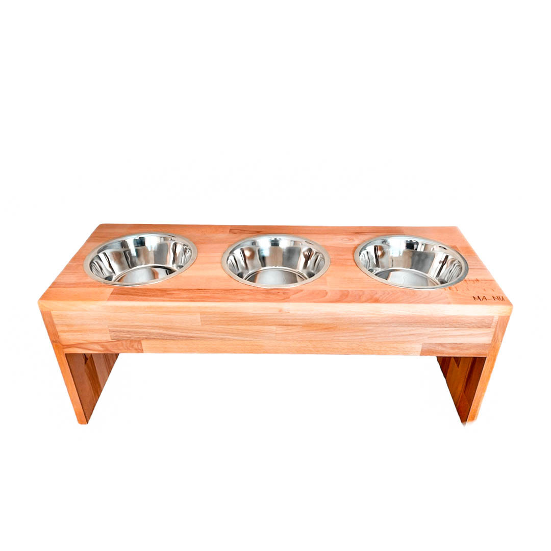 Luxusní psí bar MA-NU nabízí vašemu psímu parťákovi vyšší úroveň stolování a zdravější jedení. Podávání potravy i vody ze zvýšené polohy přináší mnoho užitečných benefitů pro zdraví našich pejsků. Zvýšené jedení významně snižuje riziko torze, vede k lepšímu trávení, pes má u stojanu stabilnější postoj, což ocení především psím senioři a nejen oni, pes nenamáhá krční svalstvo a krční páteř, klouby a svaly hrudníku.Stojany na psí misky také krásně vypadají a udělají z jídelního koutku vašeho psa luxusní psí jídelnu. Stojany jsou vyrobeny v české dílně z tvrdého bukového dřeva, které je ošetřeno velmi kvalitním olejem s atestem pro potravinářství. Olej zabrání poškozování dřeva vodou či nečistotami, zajišťuje snadnou údržbu a dlouhou životnost. Stojany dodáváme s nerezovými miskami.Proč dávat psovi jídlo do vyvýšené misky?Zvýšená poloha misky:- snižuje riziko torze žaludku, na kterou trpí hlavně velká plemena- zlepšuje trávení potravy- snižuje polykání vzduchu a následné nadýmání- páteř je v přirozené poloze - pes u stojanu drží správný postoj a je stabilnější- váha těla vašeho psa je rovnoměrně rozložena - pes nepřetěžuje klouby a svaly hrudních končetin- nenamáhá se hřbet, krční svalstvo a krční páteř- skvělá volba u velkých plemen, nebo starších psů, kteří se nemusí u vyvýšených misek přetěžovat- usnadňuje pití vody (pes méně chlemtá)- pro psí seniory „must have“ produktDůvody proč zvolit MA-NU stojan na misky:- zvýšená poloha misek přináší zdravější krmení- moderní a hezký design se hodí do každé domácnosti- vyrobeno v České republice z kvalitních materiálů- stojany jsou z ekologických materiálů- ošetřeno kvalitním olejem s atestem pro potravinářství- snadná údržba a dlouhá životnost- více druhů a velikostí- vyrobeno s láskou, poctivě a ručněVáš pes by měl být schopný jíst, aniž by snižoval krk, nebo se natahoval nahoru.MA-NU nabízí širokou a pestrou nabídku stojanů na misky jak pro malé psy, tak i pro velká plemena. MA-NU stojan Empty Three má dřevěné bočnice, je velmi stabilní a vypadá velmi elegantně. Oproti ostatním MA-NU stojanům a barům má 3 misky, což nabízí další rozměr využití (tip: skvělé použít pro více psů).Nerezové misky jsou ke stojanům zdarma.Velikosti: Velikost - šířka/hloubka/výškaM - 78,5cm/30cm/16,5cmL - 78,5cm/30cm/23cmXL - 78,5cm/30cm/30cmPrůměr a objem misek všech 3 velikostí stojanů: 21cm / 1,6 lPoznámka: Barva dřeva na obrázku se může mírně lišit od vámi zakoupeného kusu. Každý kus je originál, dřevo je přírodní materiál, proto může vykazovat mírné odchylky v barvě. Vždy jde o bukové dřevo s olejovou úpravou. Nerezové misky vynikají vysokou odolností a materiálem, který se velmi snadno udržuje.Výrobce: MA-NU (vyrobeno v ČR)Distributor: Rebel Dog s.r.o.Poslední aktualizace: 06/2023