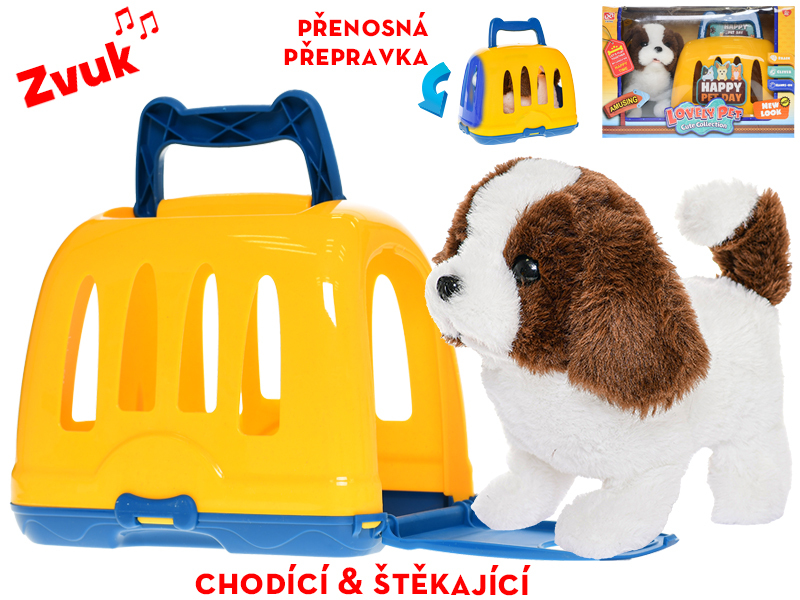 Pejsek plyšový 19cm na baterie chodící a štěkající s přepravkou v krabičce
