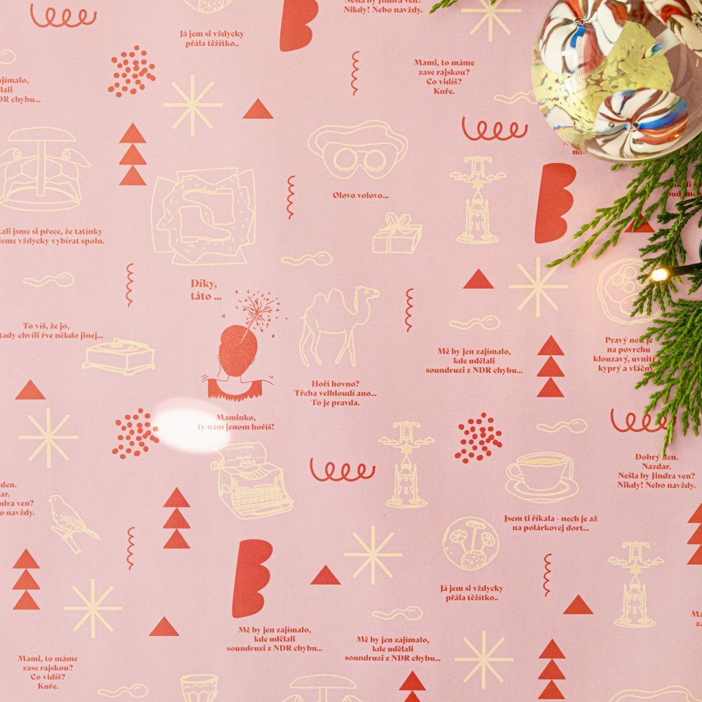Vánoční balicí papír Pelíšky růžový ilustrovala česká výtvarnice Bára z Nikolajky.