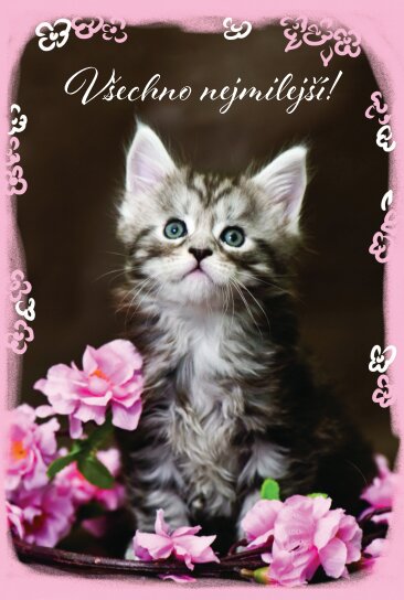Roztomilé blahopřání k narozeninám s textem na titulce Všechno nejmilejší! s koťátkem. Přání je vevnitř zdobeno motivem z titulní strany a textem: Měj úžasné narozeniny a celý rok plný štěstí! Baleno v bílé obálce. Rozměr 17x11,5cm.