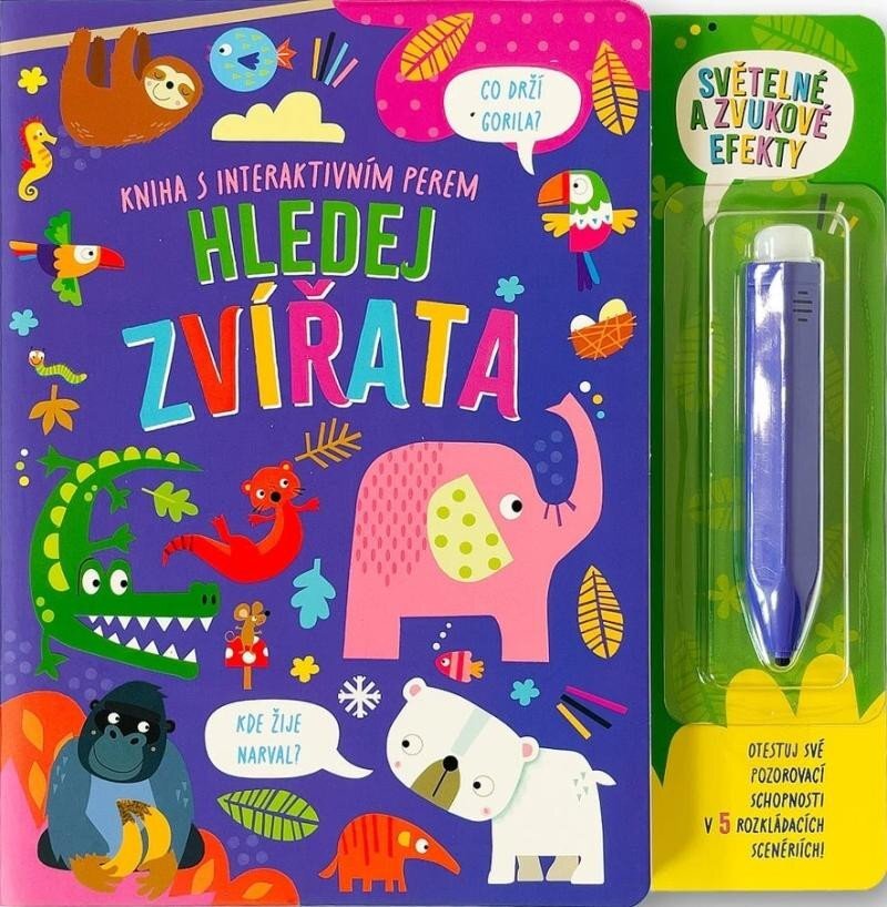 Tato kniha nabízí úchvatné rozkládací scenérie plné různých zvířat, kde děti mohou hledat odpovědi na zajímavé otázky, například kolik motýlů ukrývá džungle nebo jakou barvu má mrož. Díky interaktivnímu peru se zábava ještě více rozšiřuje - děti stisknou hrotem pera černý puntík v barevném kolečku u správné odpovědi a odměnou jim bude veselá melodie a zelené světýlko, které je povzbudí pokračovat v hledání dalších odpovědí.