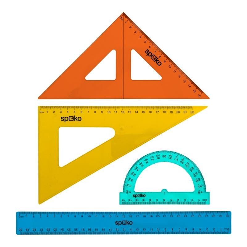 Tato sada pravítek obsahuje vše, co potřebujete pro školní geometrii: ploché pravítko, trojúhelník s ryskou, úhloměr a pravoúhlý trojúhelník. Každý kus je vyroben z pevného a odolného polystyrenu, který zaručuje dlouhou životnost i při častém používání. Praktické rozměry jednotlivých pomůcek vám umožní přesné měření a kreslení úhlů i vzdáleností.