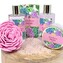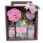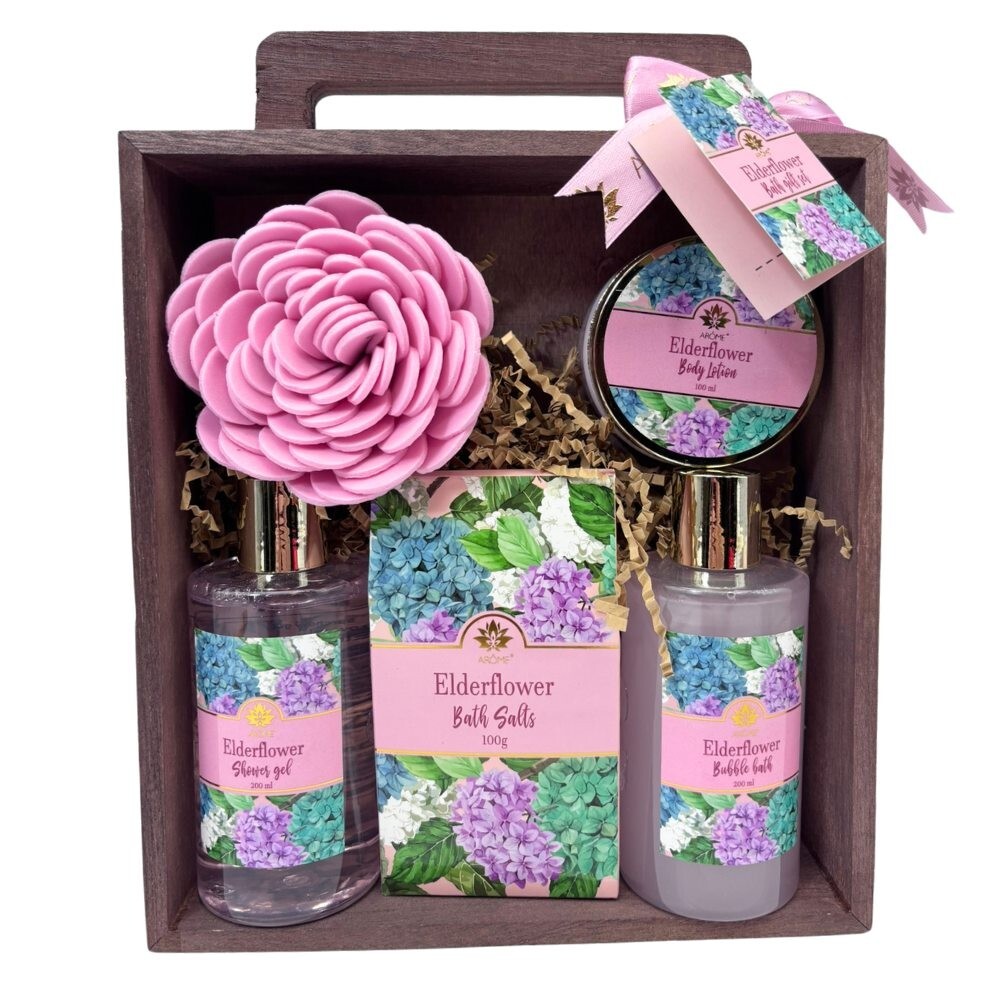 Kosmetický set: dřevěný box, 200ml sprchový gel, 200ml pěna do koupele, 100ml tělové mléko, 100g koupelová sůl, EVA mycí houba