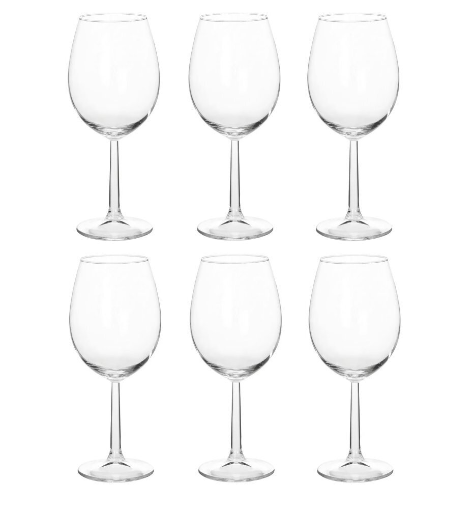 Sada 6 ks průhledných sklenic na víno, každá o objemu 350 ml, vhodných na bílé víno.Sklenice jsou vhodné do myčky nádobí.