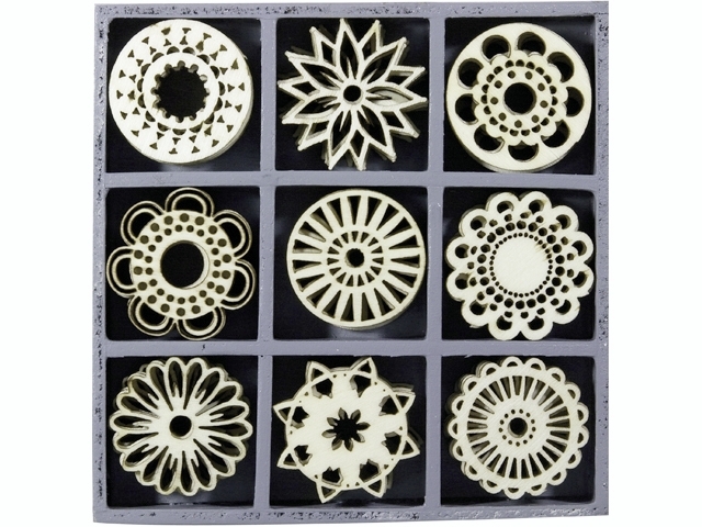 Dřevěné ozdoby v boxu 45ks - ornament - 9 motivů po 5 ks, rozměr motivu: 3x3cm.