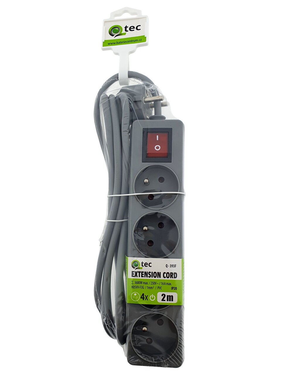 Prodlužovací přívod šedý 4 zásuvky s vypínačem, 2m, Q-393F QTEC