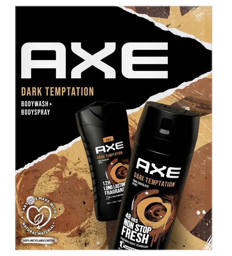 Vánoční balíček pro muže Axe Dark Temtation je plný rafinované a neodolatelné vůně s nádechem čokolády, která podtrhne charisma a navíc příjemně osvěží po celý den. Axe balíček je zde pro každého muže, který umí ocenit eleganci a prahne za skvělou vůní.