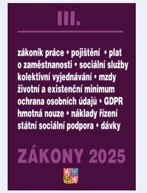 Zákony III obsahují právní předpisy pro oblast zákoníku práce, mzdových a platových předpisů, zaměstnanosti, pojištění, veřejného zdraví. Všechny právní předpisy obsahují novely zákonů schválených během roku 2024 k právnímu stavu 1. 1. 2025.