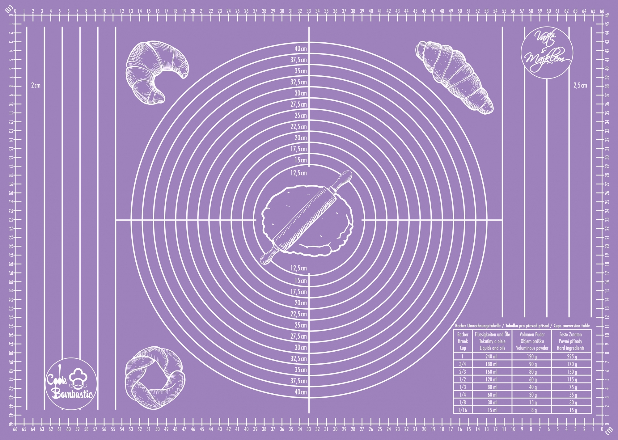 - Praktická měřítka a stupnice pro snadné vyvalování a krájení těsta.
