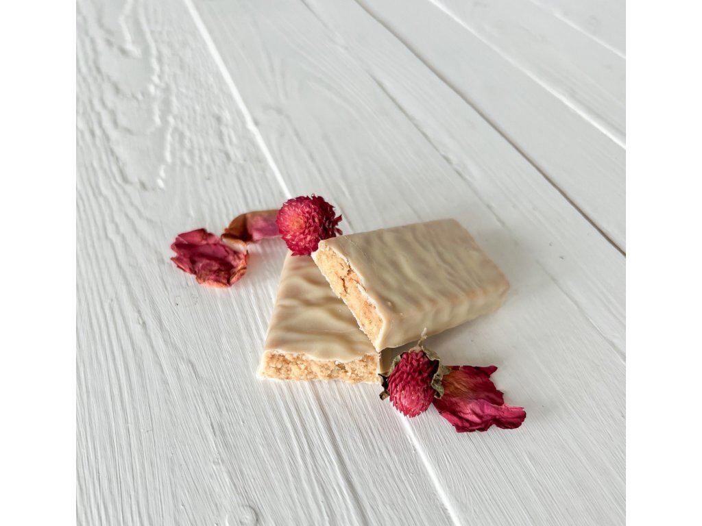 Složení: Bílá čokoláda (kakaové máslo, přírodní vláknina z kořene čekanky, sušené plnotučné mléko, přírodní kukuřičná vláknina, emulgátor: slunečnicový lecitin, přírodní vanilkový extrakt), zahušťovadlo: polydextróza, syrovátkový protein (14,3 %), sójový protein (14,2 %), zvlhčující látka: glycerol, bambucké máslo, sušené mléko plnotučné, sladidlo: erythritol, vitaminy a minerální látky: hořčík (oxid hořečnatý), vitamin C (kyselina L-askorbová), vitamin B3 (nikotinamid), železo (fumaran železnatý), vitamin E (D-alfa-tokoferol-acetát), zinek (citronan zinečnatý), vitamin B5 (D-pantothenan vápenatý), mangan (glukonan manganatý), vitamin B2 (riboflavin), vitamin B6 (pyridoxin-hydrochlorid), vitamin B1 (thiamin mononitrát), měď (glukonan měďnatý), vitamin A (retinol-acetát), vitamin B9 (kyselina pteroylmonoglutamová), jód (jodičnan draselný), vitamin K (fylochinon), selen (seleničitan sodný), biotin (D-biotin), chrom (chlorid chromitý), vitamin D (cholekalciferol), vitamin B12 (hydroxokobalamin); vanilkové aroma (0,6 %), sladidlo: steviol-glykosidy ze stévie. Obsah kakaové sušiny v čokoládě nejméně 33 %.