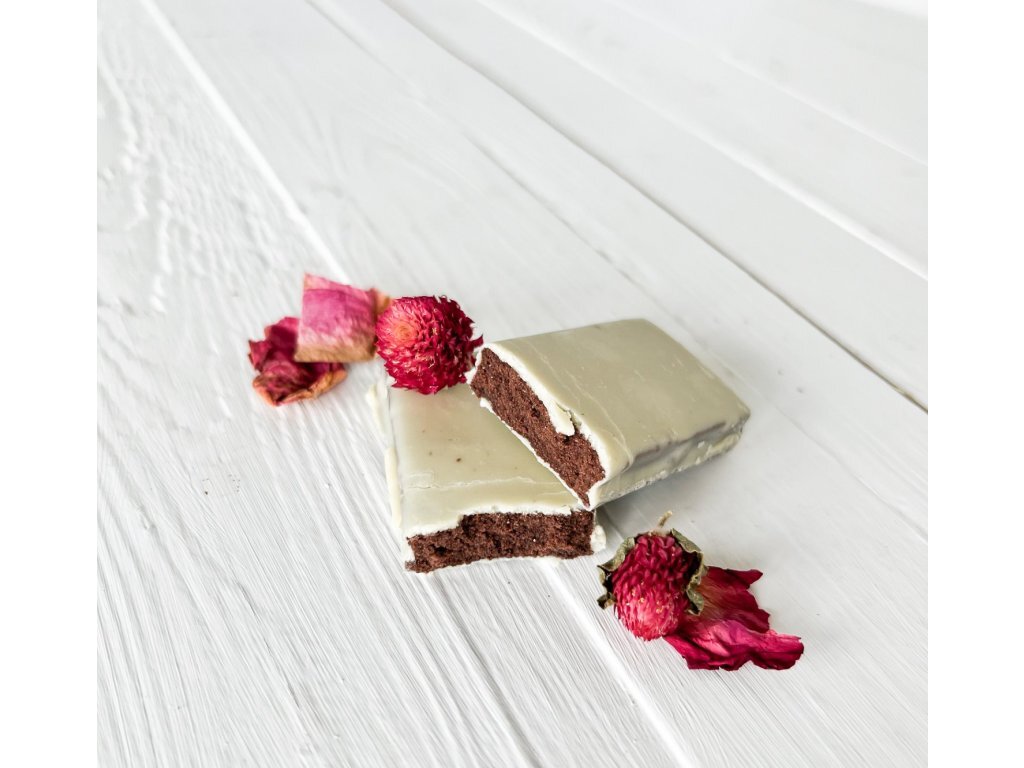 Složení: Bílá čokoláda (kakaové máslo, přírodní vláknina z kořene čekanky, sušené plnotučné mléko, přírodní kukuřičná vláknina, emulgátor: slunečnicový lecitin, přírodní vanilkový extrakt), zahušťovadlo: polydextróza, syrovátkový protein (14,2 %), sójový protein (14,2 %), zvlhčující látka: glycerol, bambucké máslo, kakaový prášek (5,7 %), vitaminy a minerální látky: hořčík (oxid hořečnatý), vitamin C (kyselina L-askorbová), vitamin B3 (nikotinamid), železo (fumaran železnatý), vitamin E (D-alfa-tokoferol-acetát), zinek (citronan zinečnatý), vitamin B5 (D-pantothenan vápenatý), mangan (glukonan manganatý), vitamin B2 (riboflavin), vitamin B6 (pyridoxin-hydrochlorid), vitamin B1 (thiamin mononitrát), měď (glukonan měďnatý), vitamin A (retinol-acetát), vitamin B9 (kyselina pteroylmonoglutamová), jód (jodičnan draselný), vitamin K (fylochinon), selen (seleničitan sodný), biotin (D-biotin), chrom (chlorid chromitý), vitamin D (cholekalciferol), vitamin B12 (hydroxokobalamin); čokoládové aroma (0,3 %), sladidlo: erythritol, steviol-glykosidy ze stévie. Obsah kakaové sušiny v čokoládě nejméně 33 %.