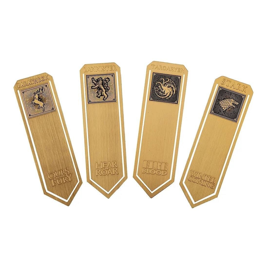 Sada obahuje 4 kovové záložky se znaky rodů Starků, Targaryenů, Lannisterů a Baratheonů z oblíbené fantasy řady Game of Thrones. Záložky, které si čtenáři Hry o trůny zamilují! Rozměry jedné záložky jsou cca 10 x 3 cm.Materiál: směs zinku číst celé