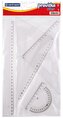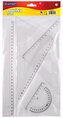 Tato praktická sada obsahuje vše, co potřebujete pro precizní práci s čarami a úhly. Součástí jsou dva kvalitní trojúhelníky - jeden s ryskou 45°/177 mm a druhý s ryskou 60°/250 mm, univerzální úhloměr 180°/100 mm s ryskou pro snadné odečítání úhlů a pravítko dlouhé 30 cm. Vše je vyrobeno z čirého plastu, což usnadňuje přesné zaměření a práci s detailními úkresy, aniž by vám cokoli překáželo.