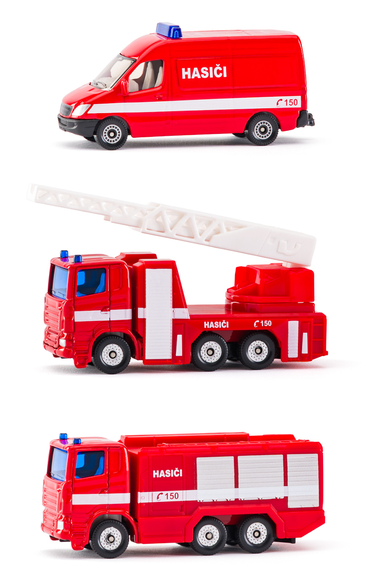 - Obsahuje tři vozidla - velký požární vůz s žebříkem, hasičskou dodávku a další velké hasičské auto