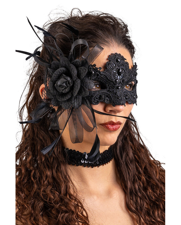 Černá ozdobná krajková škraboška pro dospělé zdobená lesklými korálky, látkovou květinou, tylem a peřím. Maska je vyrobena z pevného černého plastu potaženého tkaninou. Na hlavu se uchycuje černou gumičkou, která je součástí škrabošky. Krásný a elegantní doplněk ke kostýmu na karneval nebo plesové róbě.