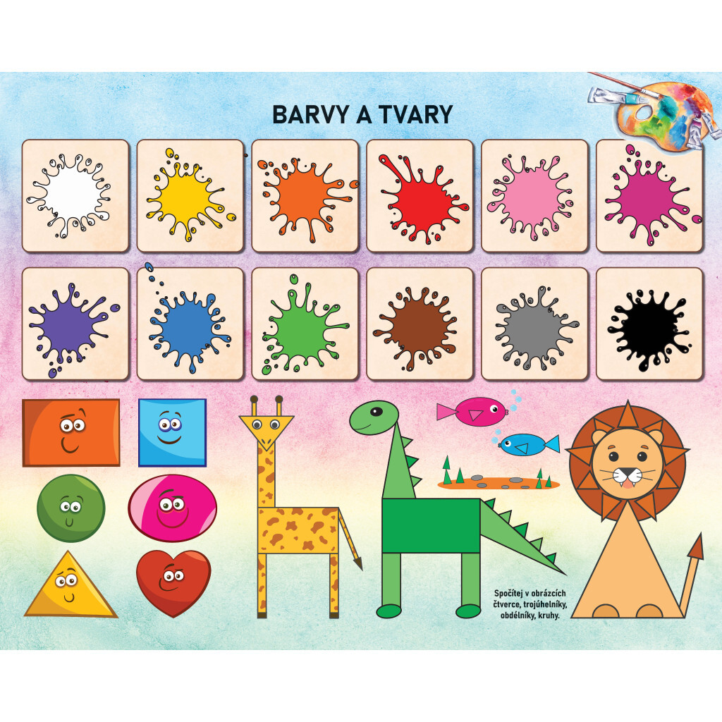 Obsahuje: jeden závěsný naučný magnetický obraz Barvy a tvary o rozměrech 100 x 80 cm (bez lišt).