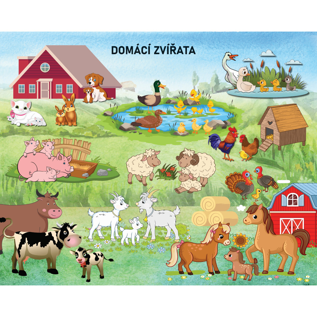 Obsahuje: jeden závěsný naučný obraz Domácí zvířata o rozměrech 100 x 80 cm (na PVC podkladu, s horní a dolní lištou, nelze používat magnetické obrázky).
