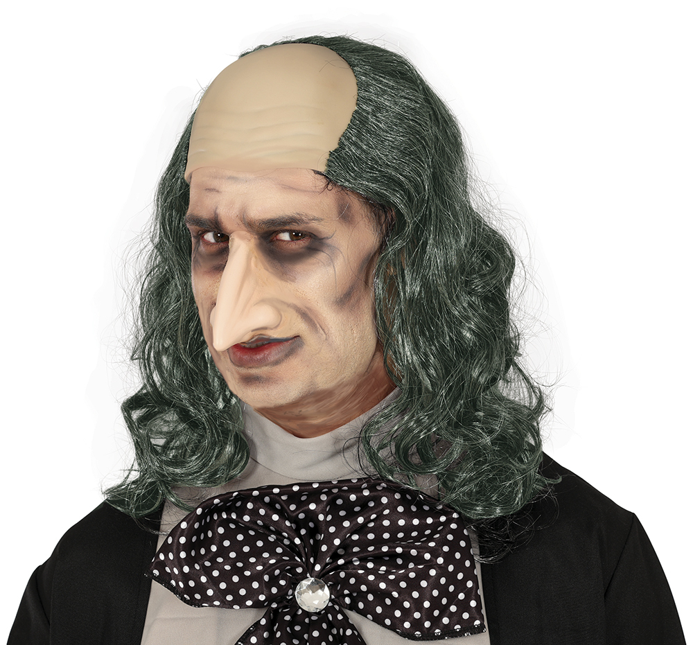 Pánská paruka s dlouhými šedými vlnitými vlasy a pleší. číst celé