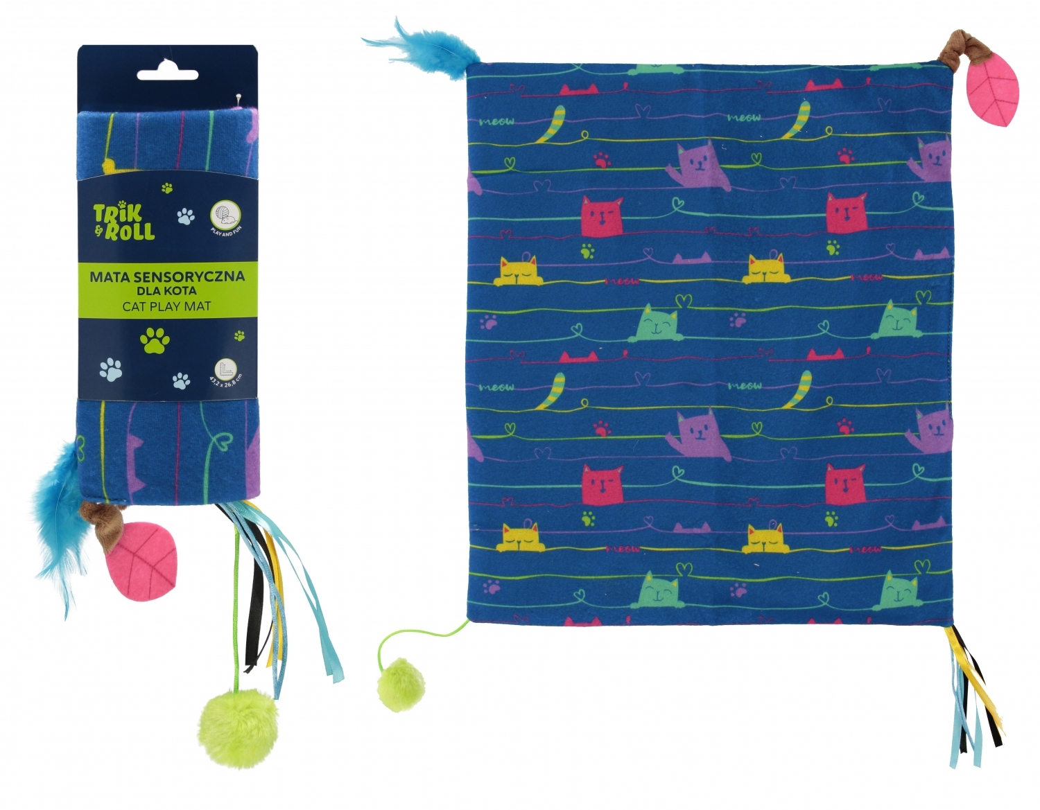 Zalety produktu: Mata sensoryczna dla kota zabawa, stymulacja i relaks w jednym Zaspokój naturalne instynkty swojego kota dzięki macie sensorycznej, która łączy zabawę z treningiem umysłowym Ta innowacyjna zabawka pobudza ciekawość, rozwija zmysły i zachęca do aktywności. Dzięki różnorodnym teksturom, dodatkami umieszczonymi i przyczepionymi do maty, kot może drapać, węszyć, podgryzać, łapać dokładnie tak, jak lubi najbardziej. Wieloelementowa struktura-różne materiały, frędzle, pluszowe piłeczki, szeleszczący materiał, stymulacja umysłowa i sensoryczna wspomaga koncentrację i rozwój zmysłów, łatwa do czyszczenia-możliwość prania ręcznego, bezpieczna i trwała-wykonana z materiałów przyjaznych zwierzętom. Zajmuje kota na dłużej i zapobiega nudzie, pomaga ograniczać stres i nadpobudliwość, idealna dla kotów w każdym wieku od kociaka po dorosłego kota, świetna alternatywa dla klasycznych zabawek dla pupilów. Wymiary/waga: wymiary produktu szer.x wys. x gł cm 26,8x43,2x1 cm, wymiary produktu z opakowaniem szer. x wys. x gl. cm 9x34x3, waga produktu kg. 0,07 kg, waga produktu z opakowaniem kg. 0,09 kg.. Zabawka pakowana w euro zawieszkę.