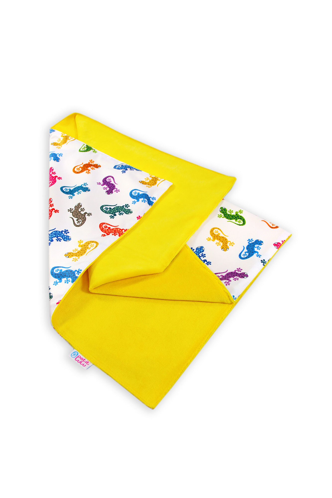 Přebalovací podložka - GekoniNepromokavá a sametově jemná podložka je výbornou pomůckou při přebalování. Vhodná je i na cesty, k lékaři, do kočárku, postýlky, na deku…Ve vzoru s hravými gekony, bude nejen skvělým pomocníkem, ale i stylovým a originálním doplňkem ve vaší výbavičce.Miminko pokládejte na lícovou (sametovou) stranu.- 70 x 50 cm