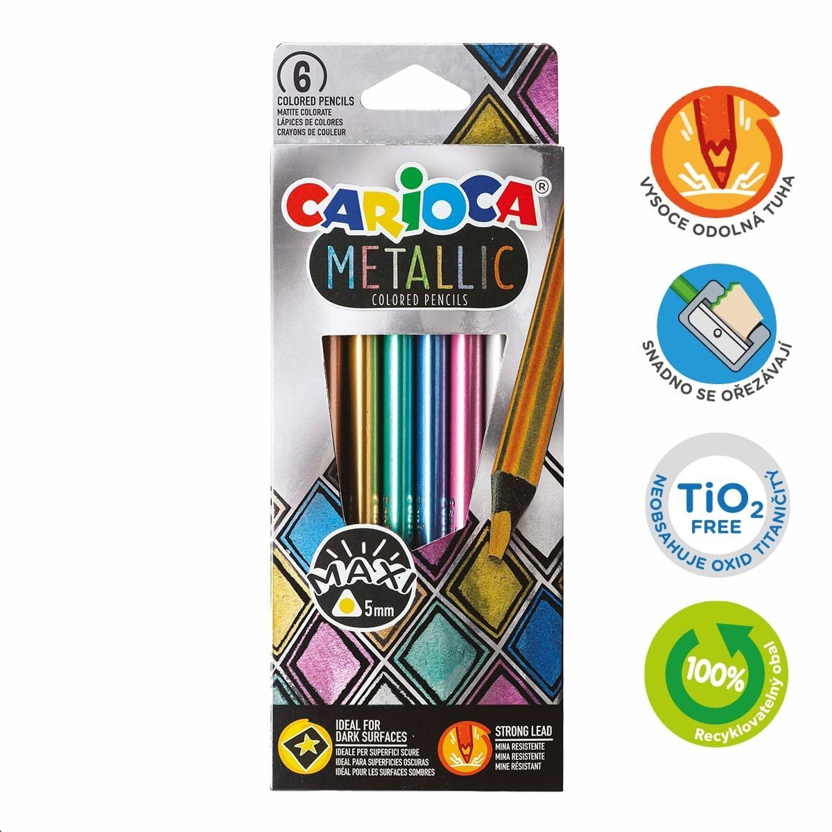 Trojhranné metalické pastelky v zářivých a vysoce krycích odstínech. Prémiová maxi tuha je odolná proti pádu, jsou tedy vhodné pro každodenní použití. Jsou ergonomicky tvarované a snadno se ořezávají. Nevhodné pro děti do 3 let. Odolná maxi tuha, průměr 5 mm, trojhranný tvar, vysoce krycí, zářivé odstíny. Metalické barvy, vynikají na tmavém podkladu, snadno se ořezávají, bez obsahu TiO2.
