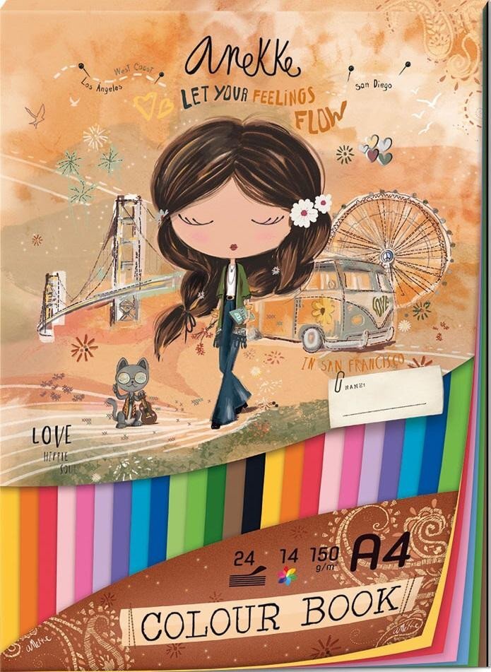 Blok barevného papíru velikosti A4 s designem známého děvčátka Anekke z dílny španělské návrhářky. • blok obsahuje 24 barevných listů v 14 barvách • list barevného papíru váží 150g • vhodné jsou na výtvarní výchovu a kreativní tvoření zvláště pro pevnější gramáž papíru