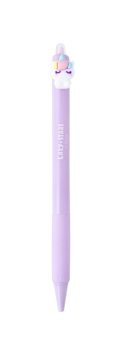 Klikací gumovací gelový roller Jednorožec s hrotem 0,5 mm, barva inkoustu - fialová. Ideální do školního penálu i jako dárek- pero píše hladce a chyby lze snadno vymazat pomocí praktické gumovací koncovky.