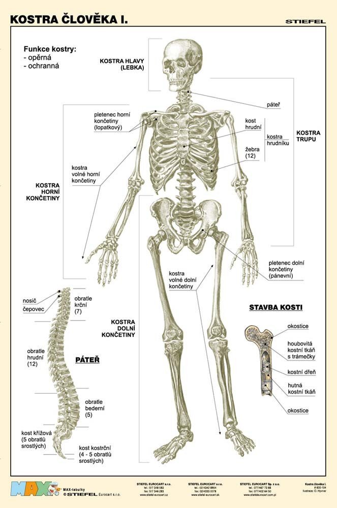Obsah naučné tabulky je zaměřen na funkce kostry, hlavní části kostry člověka a stavbu kostí. Zadní tabulky je bez textu a slouží k procvičování i zkoušení.