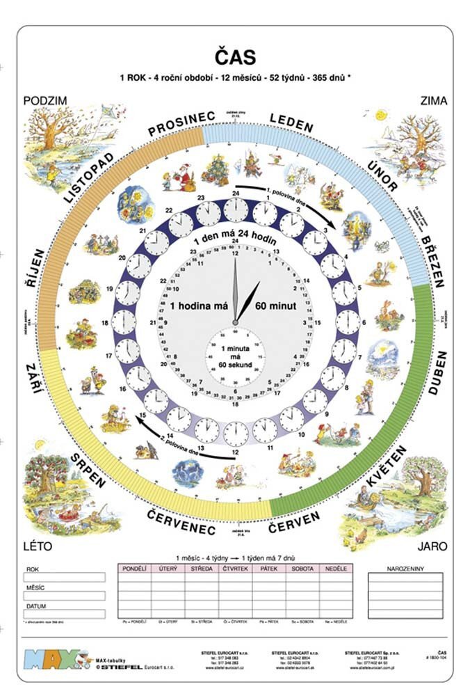 Obsah úspěšné naučné tabulky ČAS je zaměřen na osvojení si učiva především lehkou, hravou formou, podporující tvořivé poznávání hodin, částí dne, dní v týdnu, měsíců, ročních období... jejich sled a charakteristiku. Podstatnou část didaktické pomůcky tvoří ilustrace a kruh, který je zároveň hodinami i podkladem pro měsíce a roční období. Zadní pracovní strana slouží k procvičování i dalšímu rozvíjení dětské kreativity i fantazie.