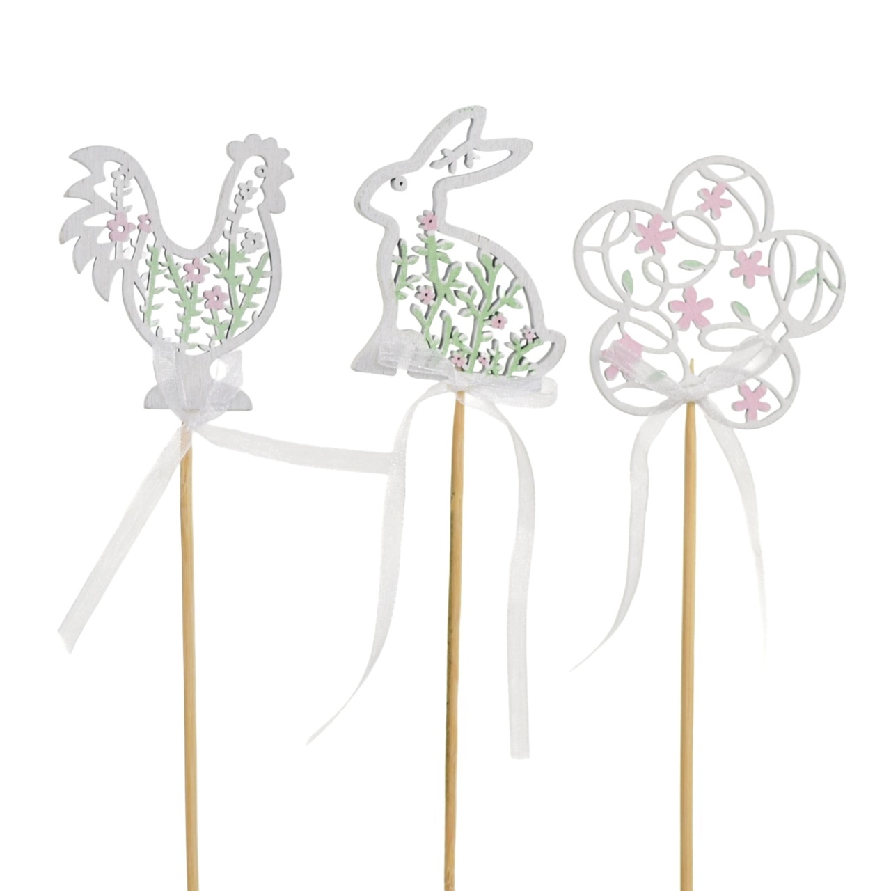 Slepička, zajíček, kytička - dřevěné zápichy 6x6/34 cm - 3 ks set