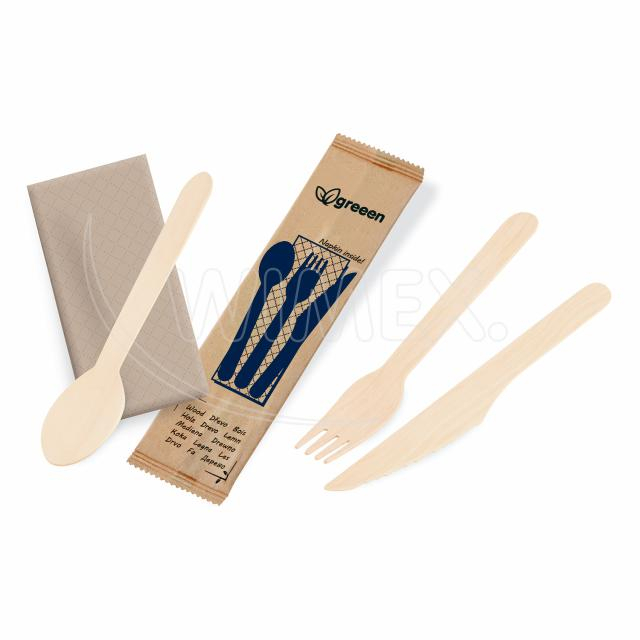 Příborová sada (dřevěná FSC 100%) nůž-vidlička-lžíce+ubrousek [50 sad]