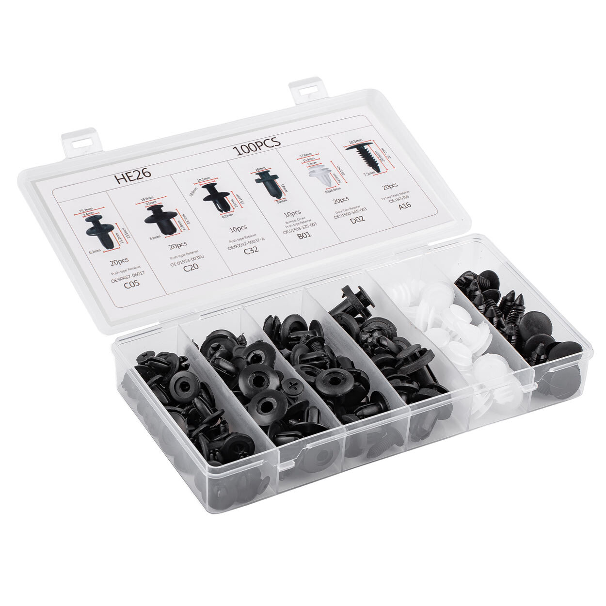 Univerzální sada 100 kusů různých sponek, čepů, karabin pro upevnění čalounění v autě, blatníků, nárazníků, dveří.