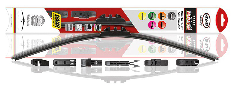Plochý stěrač se spoilerem s dokonalou aerodynamikou, díky které jsou zaručeny vynikající výsledky stírání i při vysoké rychlosti. Pryžová lišta je flexibilnější a odolnější díky nano povlaku. Stírací vlastnosti stěrače byly testovány společností Detroit Testing Laboratory, Inc. Součástí balení jsou univerzální adaptéry využitelné pro různé druhy automobilů.