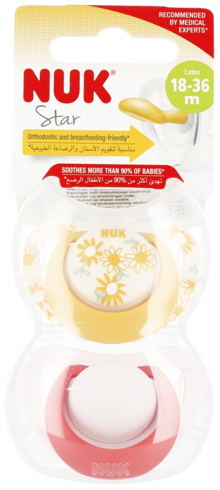 Niestety, niemowlęta nie mogą wyjaśnić, dlaczego kochają swój NUK Star tak bardzo. Ale podejrzewamy, że przyczyną jest miłe uczucie w buzi - górna część smoczka dopasowuje się delikatnie do podniebienia. Znajduje się tam miękka strefa, materiał smoczka jest bardzo cienki i wyjątkowo gładki. Jednocześnie dolna część smoczka pozostawia wystarczająco dużo miejsca dla naturalnych ruchów ssących. Ponieważ gumka smoczka jest wąska i spłaszczona, prawie nie ma nacisku na zęby oraz szczękę. W zestawie znajduje się wytrzymałe pudełko wielokrotnego użytku do bezpiecznego i czystego przechowywania. Unikalne wzory i kolory. Opakowanie zawiera 2 sz. lateksowych smoczków 18-36m wraz z pudełkiem. Wymiary/waga: wymiary opakowania dł. x wys. x gł. cm : 6x14x5, waga produktu w opakowaniu kg : 0,03 kg. Produkt przeznaczony dla dzieci w wieku: 18-36m. Pakowany w pudełeczko z zawieszką. Wyprodukowano w Niemczech.