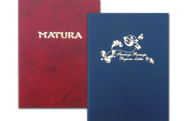 Wykonane z kartonu pokrytego skóropodobnym tworzywem, Dostępne w czterech kolorach: granatowym, zielonym , bordowym i czarnym. Elegancka oprawa introligatorska, dostępna bez nadruku oraz z nadrukiem, wewnątrz dodatkowa listwa uniemożliwiająca wysunięcie się dokumentu, wzdłuż długiego boku przepasana złotym sznurkiem dodającym elegancji. KOD 0802506, Okładka na dyplom.