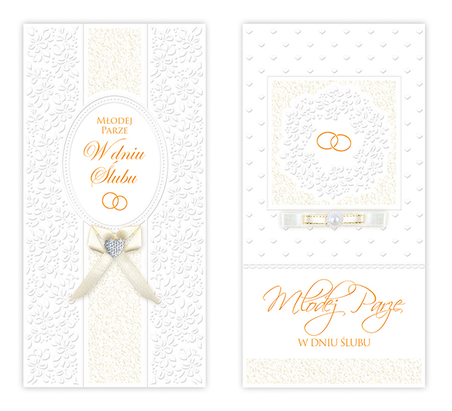 Laurka z okazji ślubu format DLBogate tłoczenia wzogacone brokatem, złocone napisyW środku tekst życzeń, białe koperty, mix papierów ozodbnychLaurki ozdobione kokardką z dżetem lub perełkąOpakowanie karton 90 szt. mix číst celé