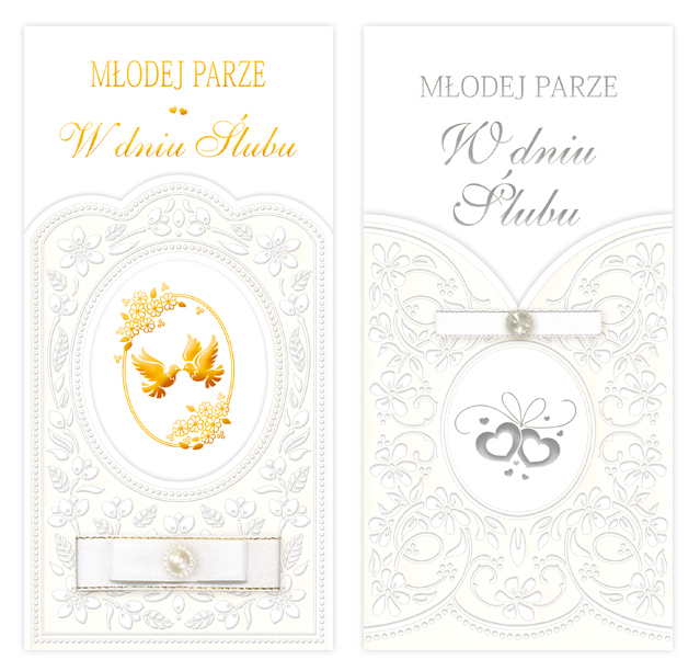 Laurka z okazji ślubu format DL w saszetceSatynowy złocony lakier wybiórczy, tłoczenia, kompozycje ze złotej folii,W środku tekst życzeń, białe kopertySaszetki ozdobione kokardka z dżetem lub perełkąOpakowanie karton 90 szt. mix