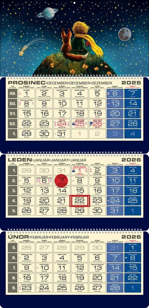 Nadčasový design inspirovaný Malým princem, doplněný 3D lakem a elegantní ražbou. Luxusní tříměsíční kalendář se jmény v CZ a SK, názvy měsíců a dnů ve čtyřech jazycích, praktickým označovačem a přehledem svátků EU. číst celé