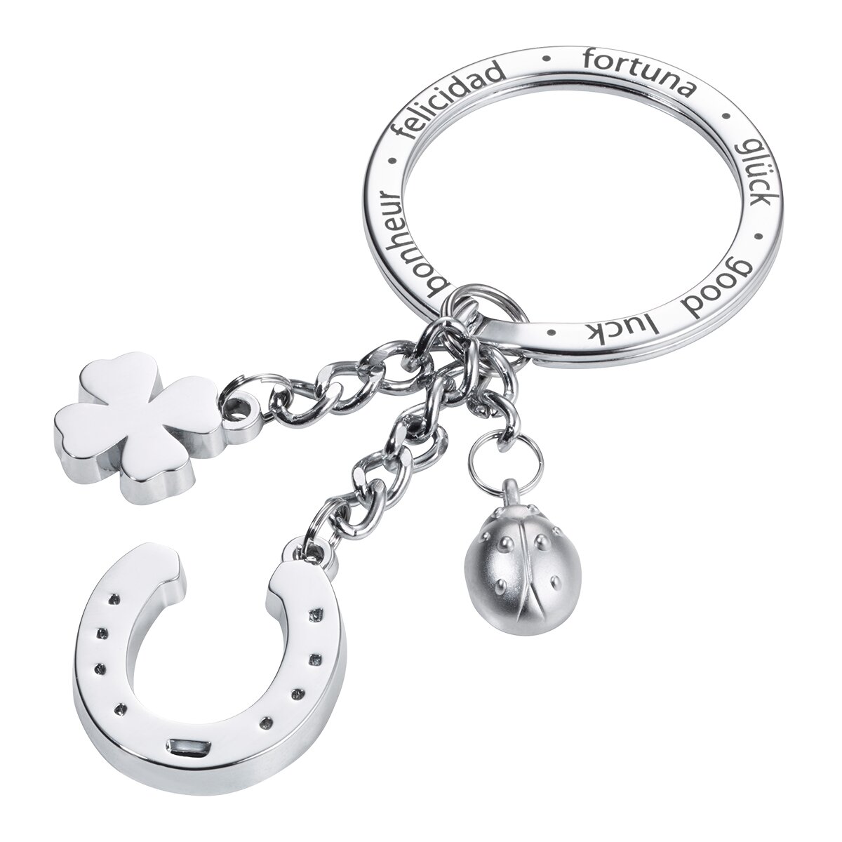 Klíčenka se 3 přívěsky - podkova, čtyřlístek a beruška. XL kroužek s rytinou „good luck“ v různých jazycích. Stříbrné provedení.
